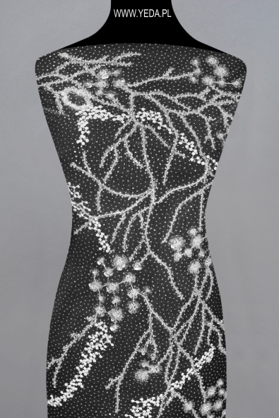 Wysokiej jakości koronka zdobiona wyróżniająca się niebanalnym wzorem oraz dekoracyjnymi detalami. Stworzona została z myślą o najbardziej wymagających kobietach, którym zależy na uzyskaniu wyjątkowej i efektownej stylizacji. Prezentowana koronka świetnie sprawdzi się jako baza ślubnej lub wieczorowej kreacji. Swój urok zawdzięcza znajdującym się na niej detalom. Odbijają one światło i rozświetlają materiał, a w konsekwencji przykuwają spojrzenia.