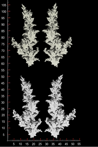 Aplikacja zdobiona, stworzona z eleganckiej koronki oraz niepowtarzalnych, rozświetlających naszywkę dodatków. Cały design produktu pozwala wykorzystać go jako wyjątkowy element dekoracyjny sukni wieczorowej, koktajlowej lub ślubnej.