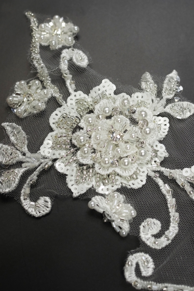 Aplikacja zdobiona, stworzona z eleganckiej koronki oraz niepowtarzalnych, rozświetlających naszywkę dodatków. Cały design produktu pozwala wykorzystać go jako wyjątkowy element dekoracyjny sukni wieczorowej, koktajlowej lub ślubnej.