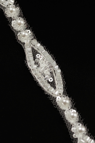 Wysokiej jakości taśma zdobiona, stworzona z niezwykle eleganckiej koronki. Zachwyca pięknymi wzorami oraz dodatkami, które podkreślają urok okraszonej nią tkaniny. Stanowi doskonałe zwieńczenie każdej sukni ślubnej, wieczorowej lub koktajlowej. Ten niepozorny detal przykuwa wzrok i budzi zachwyt.
