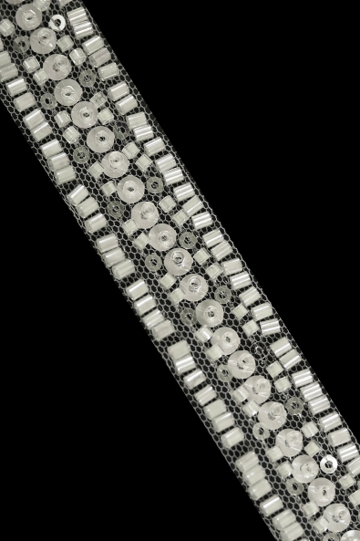 Wysokiej jakości taśma zdobiona o szerokości do 5 cm została stworzona z eleganckiej koronki, która zachwyca swoim designem. Odbijające światło elementy podkreślają nie tylko piękno samego produktu, ale także całej stylizacji go wykorzystującej.