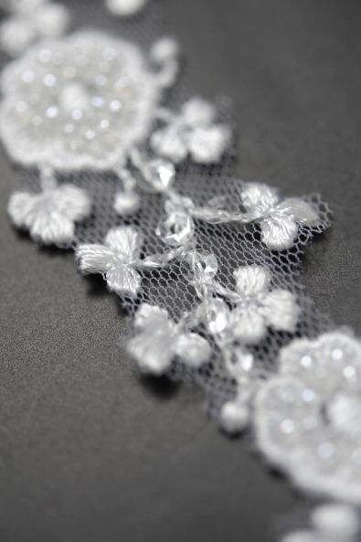 Taśma wpasowująca się w trendy wzór wyhaftowany na delikatnym, lekko rozciągliwym tiulu.