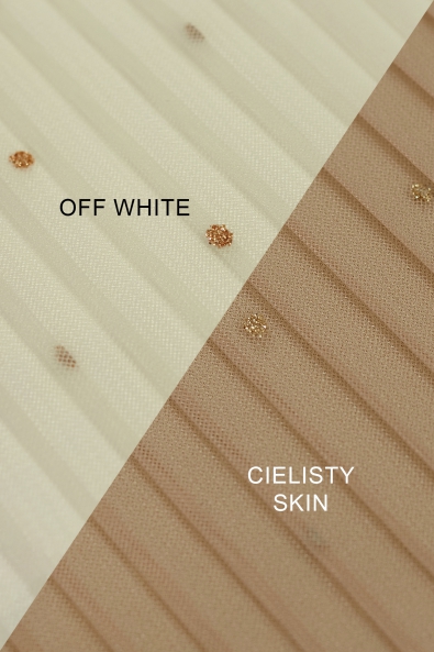 Tiul plisowany z złotymi kropeczkami to zachwycający i wszechstronny materiał, który doskonale łączy nowoczesny design z odrobiną elegancji. Wyrafinowane złote kropki z brokatem dodają luksusu tiulowi plisowanemu, co sprawia, że jest doskonałym wyborem do szycia spódnic, sukienek i różnych ubrań. Dzięki szerokości wynoszącej 150 cm, ten materiał sprawdzi się doskonale w różnego rodzaju projektach. Poza modą, nadaje się również doskonale do tworzenia kreatywnych dekoracji.