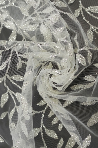 Wysokiej jakości koronka zdobiona wyróżniająca się niebanalnym wzorem oraz dekoracyjnymi detalami. Stworzona została z myślą o najbardziej wymagających kobietach, którym zależy na uzyskaniu wyjątkowej i efektownej stylizacji. Prezentowana koronka świetnie sprawdzi się jako baza ślubnej lub wieczorowej kreacji. Swój urok zawdzięcza znajdującym się na niej detalom. Odbijają one światło i rozświetlają materiał, a w konsekwencji przykuwają spojrzenia.